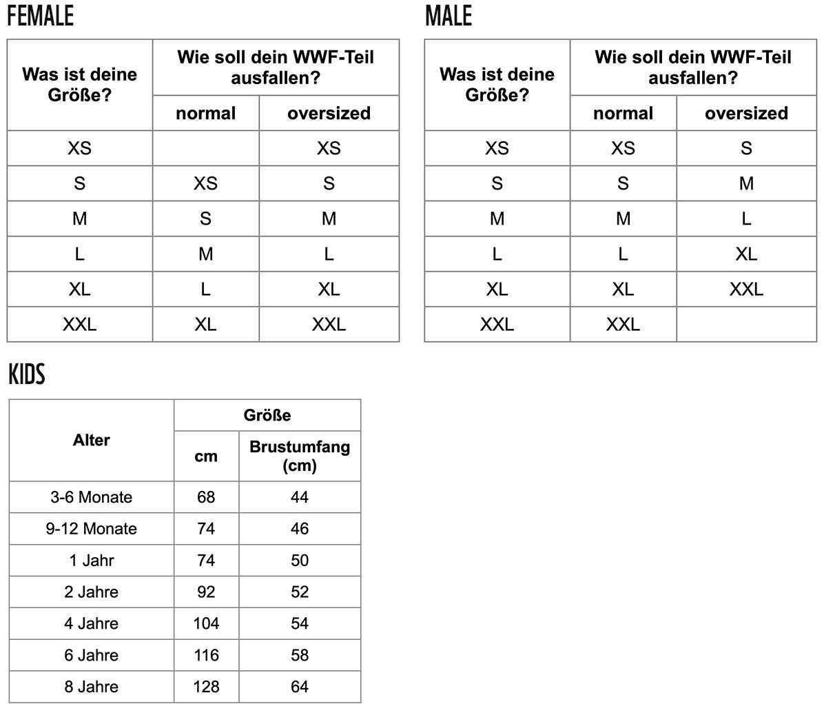 Unsere Produkte sind unisex. Da der Rest der (Mode-)Welt noch anders tickt, geben wir dir zur Orientierung diese Tabellen. Bei Fragen zu Größen & Co. schreib uns gerne eine Mail.